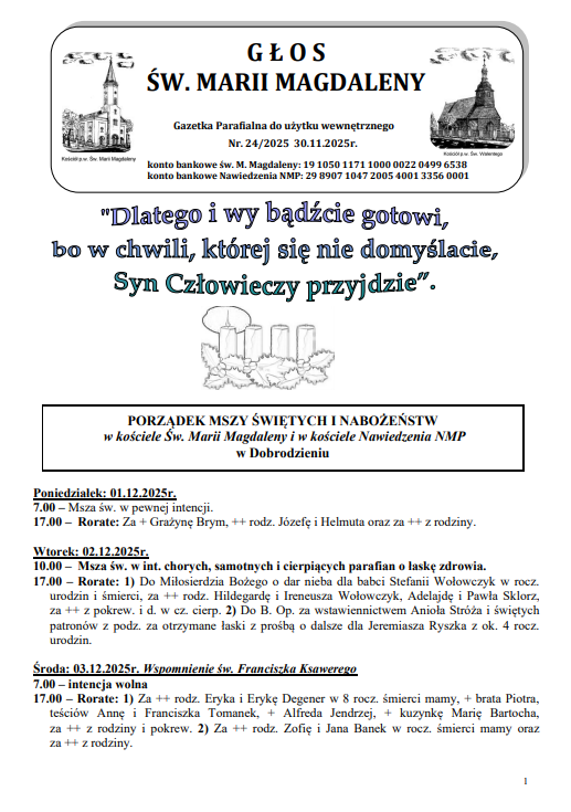 - W czwartek (04.12 2025r.) rozpoczeliśmy nasze parafialne Rekolekcje Adwentowe.przez adminRekolekcje Adwentowe, które wygłosi Ks. Dominik Paterak – wikariusz parafii Trójcy Świętej w Leśnicy. Zapraszamy do udziału w Rekolekcjach Adwentowych.